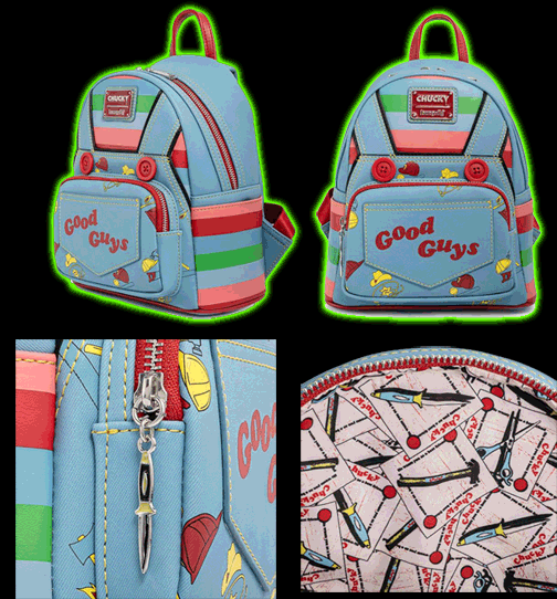 "Hi, I'm Chucky, your friend till' the end." Carry Chucky with you everywhere you go with this Loungefly Childs Play Chucky Cosplay mini backpack!