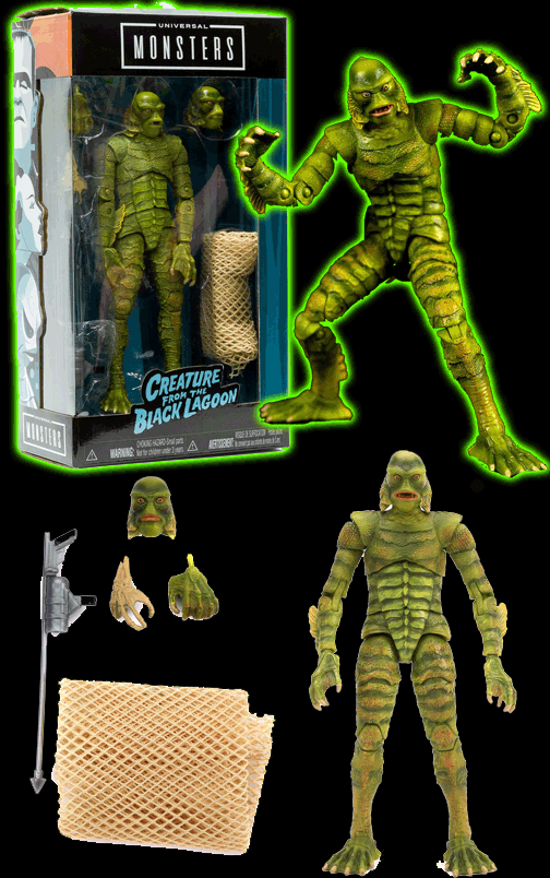 Collectors, cast your net for the elusive Universal Monsters Creature from the Black Lagoon 6-Inch Scale Action Figure with a decidedly fishy disposition. Harboring a detailed paint job swimmingly articulated form, the Amazonian Gill Man can be posed in a multitude of mannerisms with his alternate head sculpt and accessories. The Creature comes packaged in a window display box. Suitable for Amazonian Paleontologists aged four and older. Ages 4 and up.